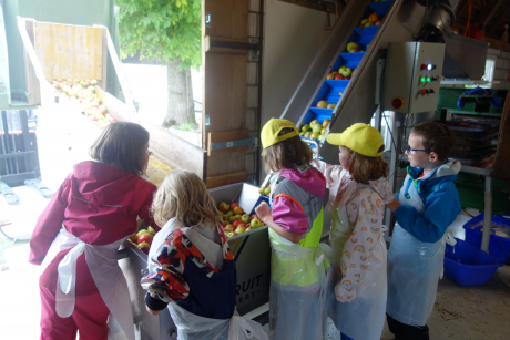 Die 1. und 2. Klässler beim Verarbeiten der Äpfel zu Most mit dabei sein, beobachten, fragen und mithelfen.